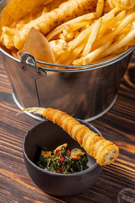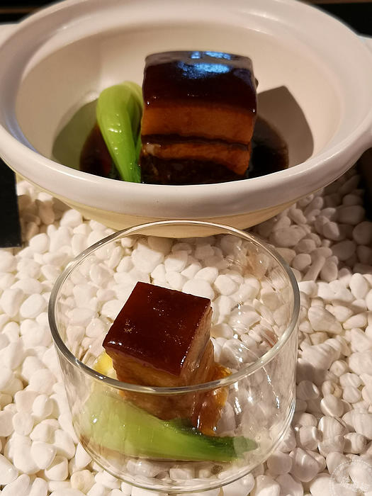 晶華主廚團隊在建構「晶華食藝銀行」的過程中,仿古朔今、配合國際廚藝潮流並吸收反芻後,融入自己廚藝想法的創新表現,展現新的風貌及變身!像是2015年來訪、韓國籍米其林二星主廚林正植的客座菜餚半熟放牧蛋,晶華主廚團隊使用鵪鶉蛋代替原本食譜中的放牧雞蛋,以約60度溫度蒸煮25分鐘後,再快速放入冷水中靜置幾秒瀝出,去殼呈盤置於碗內,佐以炒至酥脆焦香的培根碎、切丁洋蔥、櫻桃番茄以及松露酒醋醬汁,搭配香酥鍋巴與毛豆而成,滑嫩的蛋液中透出豐美的香氣,小巧的比例恰到好處地宛如Amuse Bouche開胃小點化的完美開啟了味蕾;英國療癒小食(Comfort Food)--炸魚薯條(Fish & Chips),搖身變為小巧易就口的鳳尾魚馬鈴薯,料理過程是先將新鮮鳳尾魚洗淨,再將新鮮馬鈴薯去皮後,刨成絲狀捲在魚身上,裹粉放入約180度油鍋中炸至金黃起鍋,造型改變、美味不變。