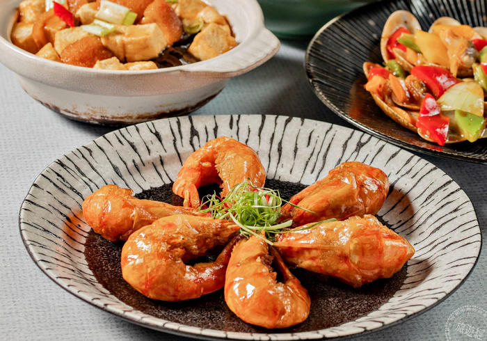 另外,海鮮單元內的「艇家絲瓜煮魚鰾」則是鄔主廚想要傳遞給食客們的家鄉滋味,「艇家」這個名稱源自於90年代香港銅鑼灣的避風塘,當時為了要服務遊艇上客人,漁民會將小艇(艇仔)當成美食廚房、於海上販售現場烹調的鮮美漁獲,廣受歡迎後即衍生成為代表道地避風塘美味料理的專有名詞。主廚選擇台灣本地的鰻魚魚鰾入菜,此部位爽滑柔嫩,口感更勝於豆腐,是很多老饕心中的夢幻食材,烹調時須先將魚鰾洗淨切塊,再與豬絞肉、海瓜子肉、魚肚、薑片、草菇一起入鍋慢炒入味,最後再放入鮮甜爽口的澎湖絲瓜,集合海鮮與蔬菜的鮮甜滋味。