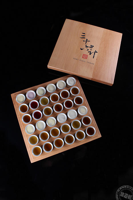 水晶廊人氣「三十六計調酒SHOT盤」結合了六款台灣茶與六款西方茶,研製出共三十六支茶酒