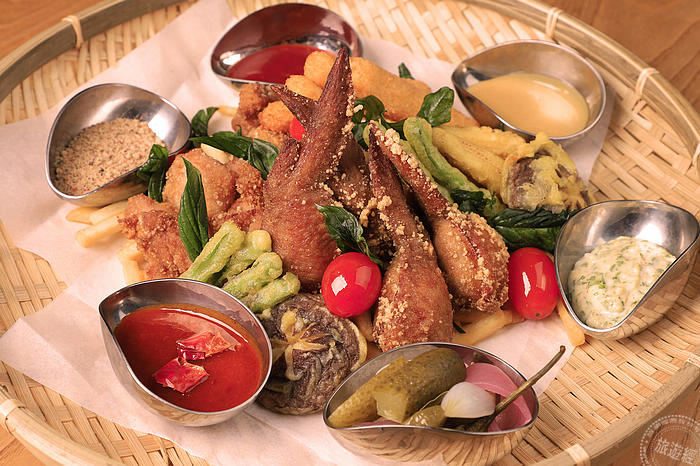 水晶廊全新「36炸」包括日式龍田揚、明太子手羽先、美式炸薯條等六款香酥拼盤,搭配六種主廚特調醬料