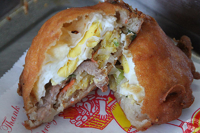 虫弟餅有點像台灣縮小版的「蚵嗲」,餅皮大多以黃豆、在來米製作,不同於台灣蚵嗲放入韭菜、高麗菜,虫弟餅除了皮薄,內餡則是蔬菜粉絲、蛋及蚵仔等!