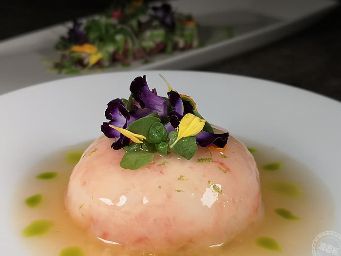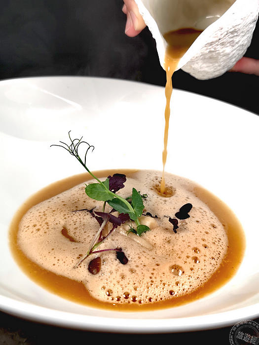 「甜蝦薄片布瑞塔」是一道冷前菜,像是走道花園的噴水池之前,讓人感受一股沁涼,但這卻是一道經典義大利沙拉Caprese的升級解構版。Caprese的三大元素為番茄、馬茲瑞拉起司以及羅勒,主廚則是以生食級甜蝦包覆奶香濃郁布瑞塔起司(融合瑪茲瑞拉起司與鮮奶油),搭配蘋果丁、番茄澄清湯和羅勒油製成,品嚐時蝦肉的鮮甜與起司的奶香在口中完美結合,搭配蘋果和番茄澄清湯的酸香清甜,巧妙將Caprese沙拉提升至另一層次。