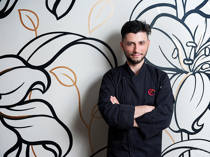 CROM Taipei - 新任義籍駐店主廚達利歐‧布雷克 Dario Bracco,主廚背後是一道美麗的網美牆(圖:業者提供)