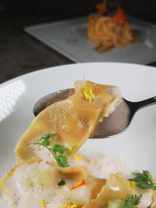 「鮮魚長方餃搭瑪茲瑞拉起司」像是來到花園的池塘,以北義倫巴底大區的傳統麵餃的「長方餃」(Casoncelli)為主軸,內餡通常是包入鹹度較高的肉品和起司,滋味濃郁厚重,主廚發揮創意巧思改選用滋味清鮮的七星鱸魚,去皮煎過後與馬鈴薯泥、風乾蕃茄製成內餡,並以手工麵皮包覆成麵餃。細緻魚肉甘鮮清爽,搭配油水分離的起司水、帕達諾起司、綠竹筍丁及巴西利油,輕盈純淨不膩口,顛覆傳統長方餃厚重濃郁滋味。