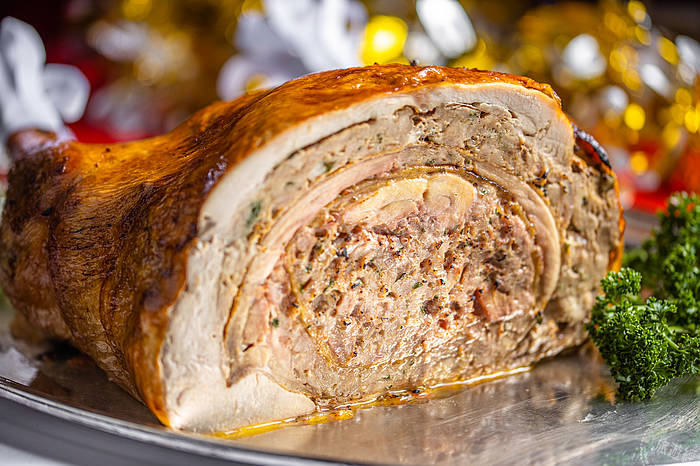 法籍行政總主廚諾爾(Noel)將整隻雞塞入鴨中,再將鴨豪邁的塞入火雞內的「皇家爐烤火鴨雞Turducken」(圖:台北晶華提供)