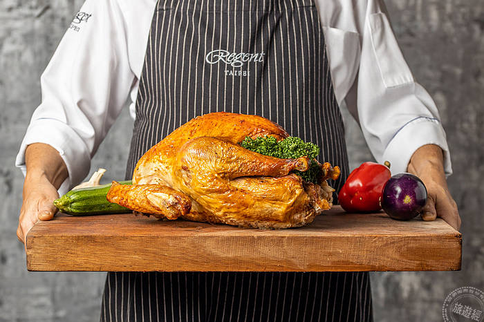 市場上難得一見的「皇家爐烤火鴨雞」英文名為「Turducken」,結合了英文字Turkey(火雞)、Duck(鴨),和Chicken(雞)而成,由法籍行政總主廚諾爾(Noel)精心設計打造,外皮金黃酥脆、肉汁豐腴飽滿,因雞、鴨、火雞「融合」故重達約7公斤,這「火鴨雞」最外層為火雞,火雞再包入整隻鴨,鴨肉中又包裏整隻雞,因此主廚們將它取名為結合火雞、鴨,和雞的「火鴨雞」,是今年感恩節系列美食中,最亮眼的商品。
