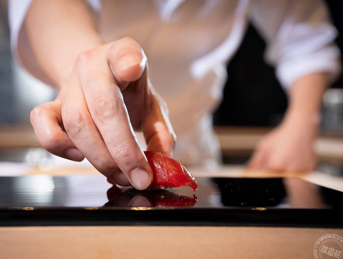 而在壽司捏製的過程中,醋飯的溫度則是非常重要,經過主廚精準的掌控以及整個團隊的配合,將溫度控制在最貼近人體肌膚的溫度,才能搭配出食材最高的美味。此外,結合食材與米飯兩者的關鍵便是師傅的「手技」,握壽司猶如在師傅手中曼妙跳舞般,在不疾不徐的一捏一轉間,讓醋飯鬆緊有度,鬆的讓米粒與米粒間保有空氣感,卻又緊得讓魚片和米飯合而為一,貫貫融在口中,幸福滋味油然而生!