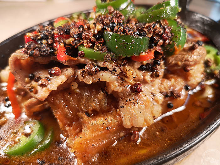 冬日開胃的「川味水煮鮮牛肉」,是愛好食辣饕客必嚐的最佳選擇,擔綱靈魂要角的川味紅湯,先將大紅袍花椒、乾辣椒、蔥、薑、蒜等辛香料與素有川菜之魂稱號的郫縣豆瓣醬共同拌炒後,加入牛骨高湯慢熬30分鐘而製成,上桌前先以油花均勻的美國牛五花、銀芽及老油條平鋪於鑄鐵鍋底,再將蒜頭、蒜苗與乾辣椒爆香後與紅湯勾薄欠加以高溫沖淋,最後撒上花椒粒、糯米椒、藤椒與自製花椒粉增色添麻,再綴入些許熱香油提味,十足的椒麻辛香即能滿足口腹之癮!