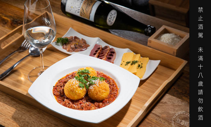 「獺祭酥炸飯球佐波隆那肉醬」同樣使用義式燉飯做法,將酒米煮至五分熟保留米心,塑形為圓球狀的酥炸飯球裡,隱藏著香氣迷人的融化起司,搭配不混入豬肉的純牛肉製作肉醬,冷冷的天氣品嚐暖身暖胃。值得一提的是,佐餐酒款〈阿部REGULUS〉為酸度較為顯著的生酛風格,因此搭配肉醬的酸甜,能為酒款帶來更為圓潤、香甜風格。