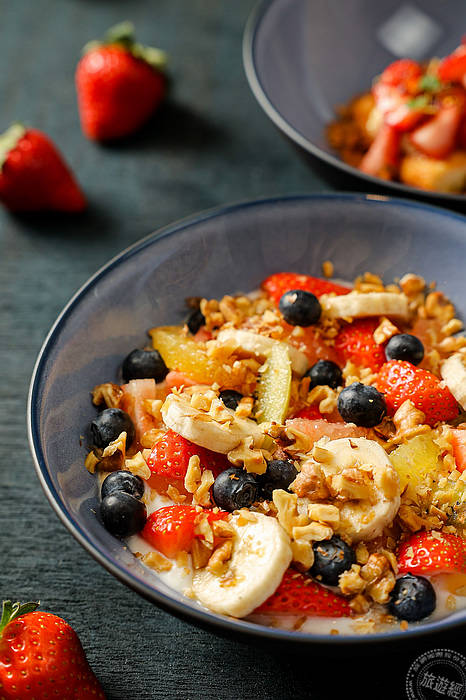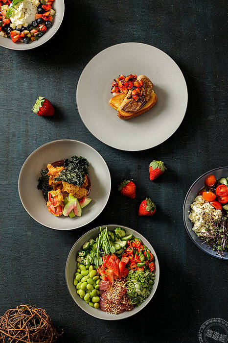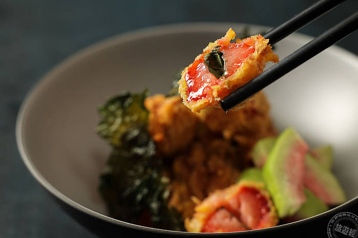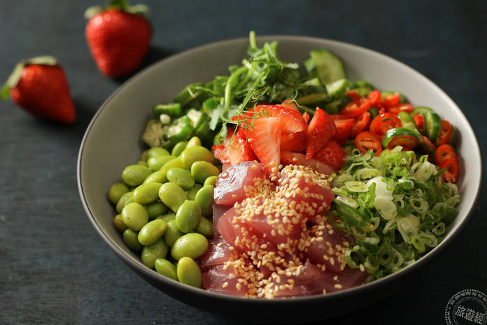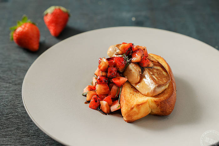 主廚在「Super Bowl草莓季」系列菜色中,以草莓為主角做了拌飯、天婦羅、鴨肝布里歐等等!其中主廚首推概念源自於夏威夷的蔬果生魚蓋飯(Poke Bowl)—「夏威夷風草莓鮪魚拌飯」──底層鋪上香Q的醋飯,再分別疊上毛豆、新鮮酪梨切塊、小黃瓜、醃辣椒、生鮪魚,以及自製風乾草莓,上桌前淋上以薄鹽醬油、哇沙米、韓國芝麻醬和蜂蜜製成的醬料,鮪魚的腴香和豐富的蔬果口感解膩相輔,尾韻則竄出帶有微微辛辣的風情;「草莓鴨肝布里歐」──以經過酥烤的布里歐麵包當底,再放上以鐵板香煎、口感圓潤綿密的加拿大Rougie鴨肝,佐以加入義大利著名巴薩米克醋(Balsamic Vinegar)製成的草莓特製醬料,整道菜同時演繹酸甜香嫩的多重滋味。