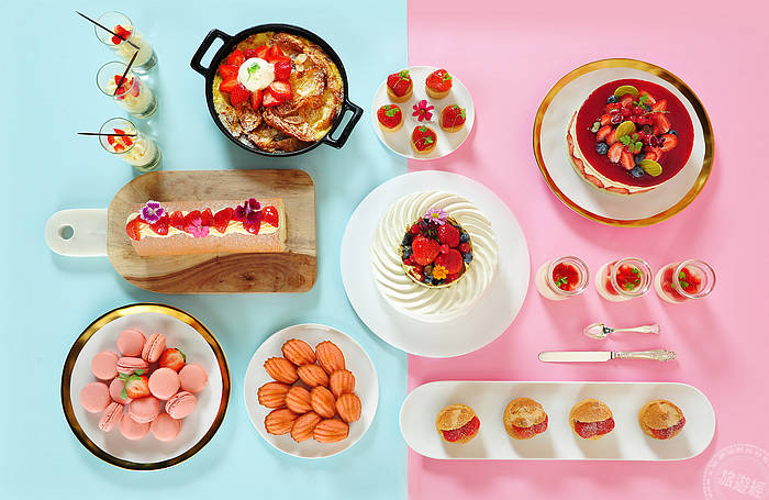 搭配分別以優格薄餅、跳跳糖以及藍莓為主角的草莓甜品(圖:台北晶華提供)