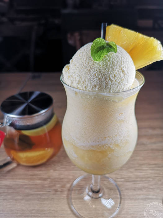 泰迪農園咖哩也推出鳳梨口味的水果茶冷熱飲以及鳳梨冰沙,其中水果茶,特別選以紅糖搭配當季新鮮鳳梨熬製成果醬,再拌入新鮮蘋果、香吉士與金桔製成的飲品〈水果茶/180元〉,主廚說一般白糖雖然甜度夠,但是香氣卻不足,而紅糖則是在時間與溫度的加成下,展現豐厚的茶韻,這款帶些許懷舊滋味的醇厚滋味;新鮮鳳梨打成冰沙,搭配一球香草冰淇淋、新鮮鳳梨片,鳳梨冰沙 NT$180。