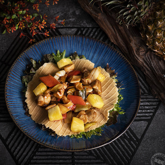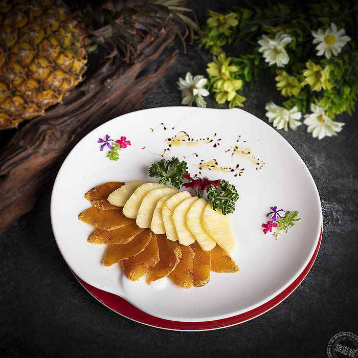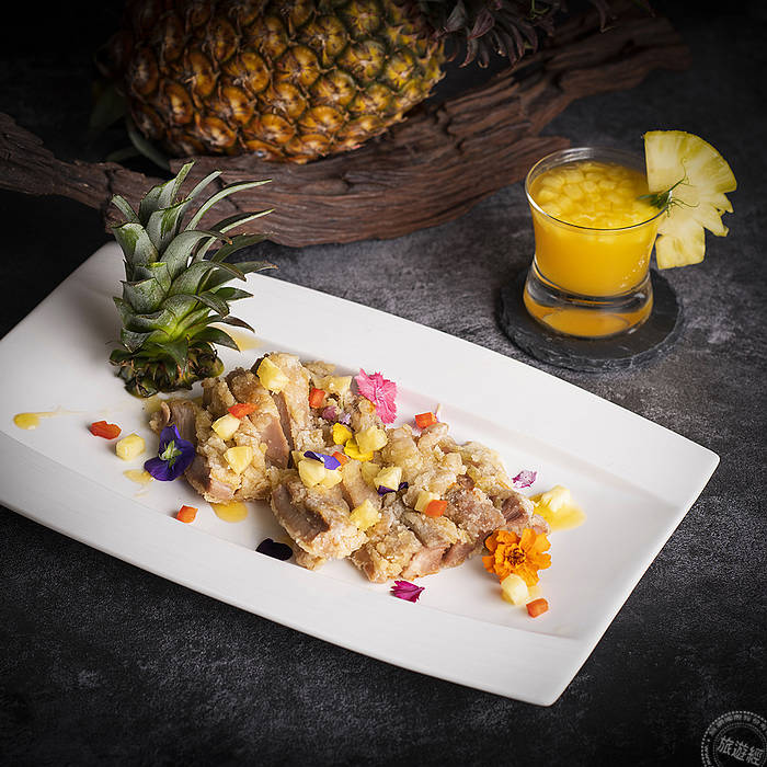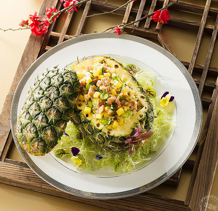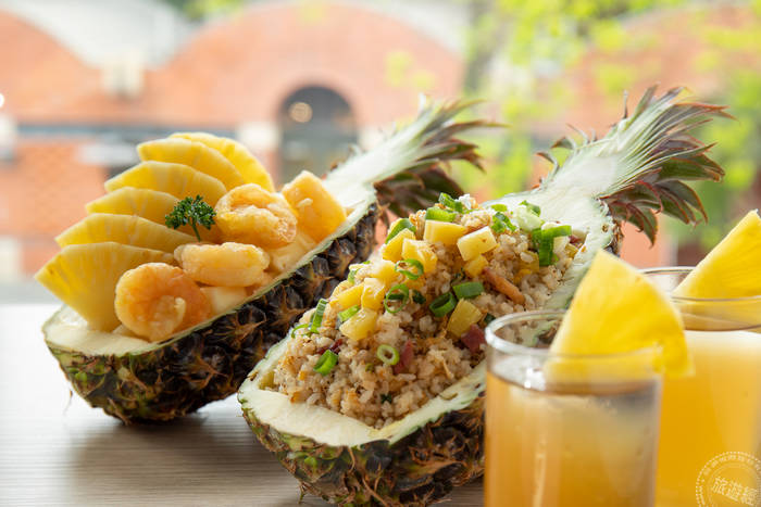 宜蘭傳藝老爺行旅,於去年甫獲經濟部經典台菜餐廳-手路菜中餐廳,推出限量供應旺來好運雙人套餐750元(需另加一成服務費),其中包括「鳳凰炒飯」,主廚以新鮮鳳梨搭上宜蘭鴨賞、三星蔥、蘭陽五農米,精湛手藝創意呈現,鳳梨的酸甜與鴨賞的鹹香,搭配起來毫無違合感,反而相當開胃,口感且特別。除了餐廳以鳳梨入饌,推出鳳梨料理外,同時飲品也以鳳梨為元素,加上客房內新增鳳梨果乾等!