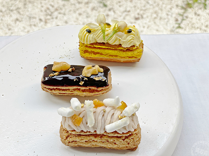雖然在家享用餐盒,法式飲食的儀式感也要有,開場的餐前麵包絕不能少。鹽之華提供以高品質冷壓初榨橄欖油製作的麵包棒與手工麵包,讓您在家也能享有餐廳用餐的儀式感;湯品,則是以蔬菜為基底的每日湯品,主廚依照當日食材製作不同風味湯品,有牛肝菌菇、白蘆筍濃湯等。而甜點部份,主廚以外帶方便易食,品嚐時無須任何餐具即可享用的想法,設計三款閃電泡芙,賞心悅目外型,飽滿的美味內餡,防疫宅家時刻,在餐後來個繽紛可愛的閃電泡芙,療癒感十足。