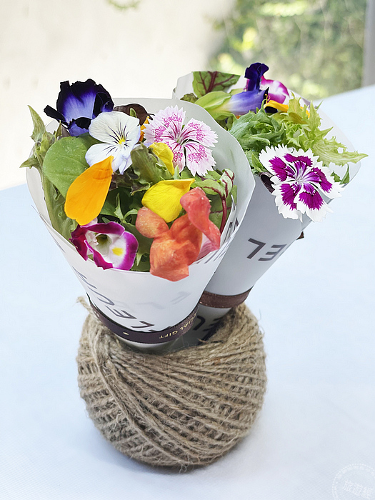 綜觀這一次法式餐盒中,最受矚目的這一束──「花束生菜沙拉」,不僅小巧可人,裡頭的可食食用花朵,就包括:紅橡木、綠橡木、紅捲、綠火焰、紅火焰、酸膜、甜菜苗、芥菜苗、金水菜、芝麻葉與小農食用花朵,富含多達10款,搭配經典法式醬,清爽開胃,在包裝上也富含巧思,以花束造型裝盛生菜,像束美麗的鮮花擺上餐桌更加賞心悅目。