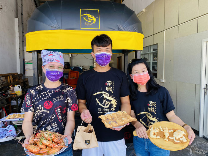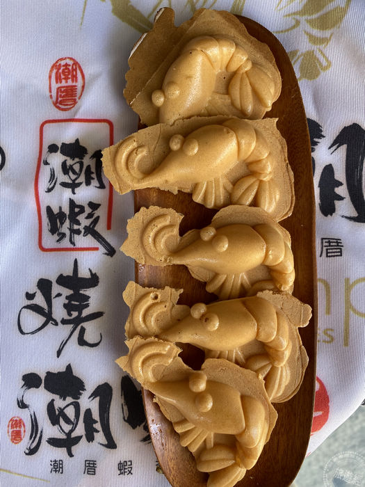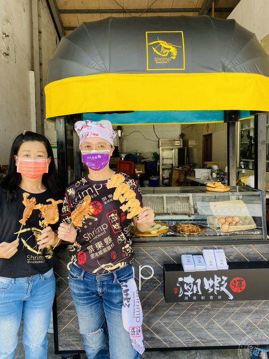 如何凸顯潮厝社區泰國蝦產業特色呢?她們以國民零食雞蛋糕結合泰國蝦進行研發與生產,運用泰國蝦進行雞蛋糕模型製作,將整隻泰國蝦入餡,呈現內外都「食」在的蝦款,並結合行動創業的攤車,打造新品牌「潮蝦」,將結合地名、青年力量、社區產業的泰國蝦雞蛋糕取名為「潮蝦燒」,作為市場區隔,這款「蝦款」感覺「蝦款」(台語),就等消費者嚐嚐便知!
