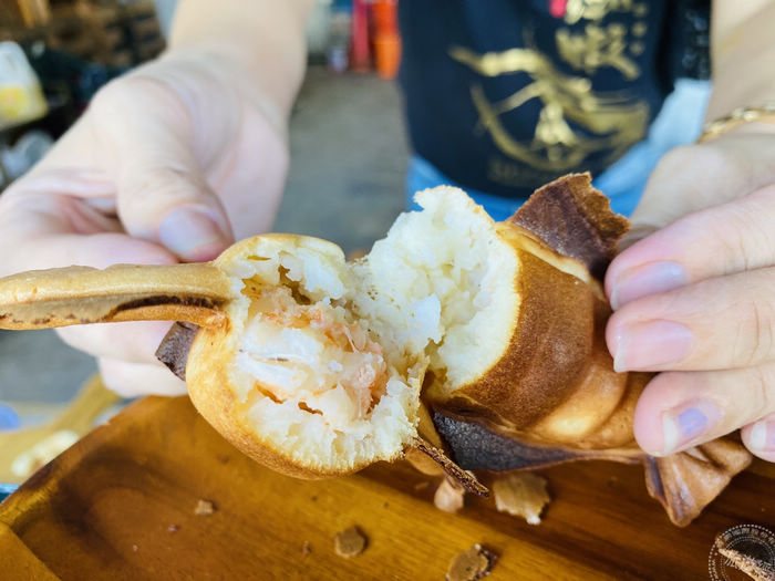 除了外型講究外,內餡也越發奇特,過往的內餡可能有奶酥、卡士達、紅豆、巧克力、起士等,現在還有業者加入新元素,來自屏東里港鄉潮厝社區李羿頻、李佳燕、李佳鈴三位青年創意發想,將社區重要產業-泰國蝦入餡,打造「潮蝦」新品牌,結合時下創業流行的行動攤車,有別於鯛魚燒、大鐘燒等,推出泰國蝦雞蛋糕-「潮蝦燒」,顛覆大家對雞蛋糕產業的視覺與味蕾。
