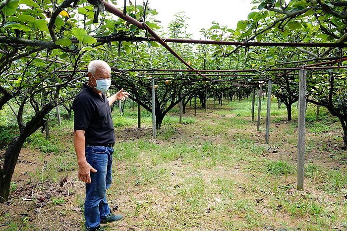 三芝區「老實人的花果樹園」農場主蔡興原先從事服裝產業,退休後決定歸零返鄉種起果樹親近大自然,現年76歲的他已種植果樹約15年,起初返鄉對果樹一竅不通,因緣際會接觸三芝果樹產銷班學習種植果樹的技術,恰巧配合三芝地區得天獨厚砂質土壤的特性,開始了他種植水梨的生活,透過山楂的基部嫁接蜜雪梨,再高接豐水梨花苞,成功讓約一公頃的果園在產季期間收穫滿滿。