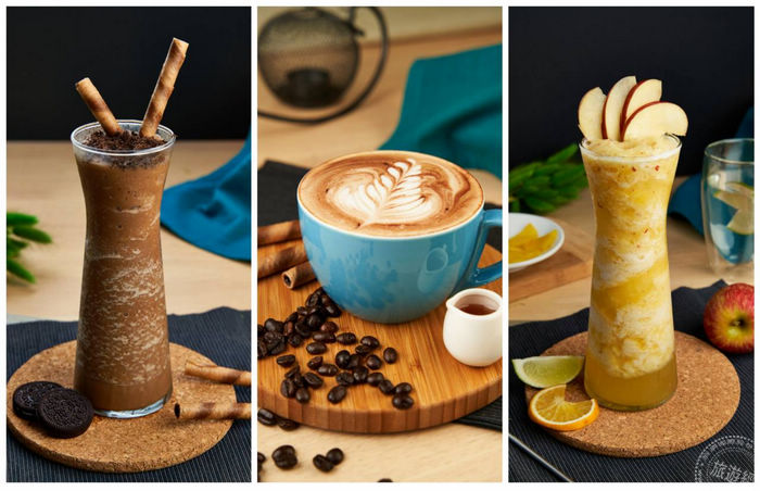 (左)摩卡冰沙;(中)熱拿鐵;(右)蘋果鳳梨冰沙