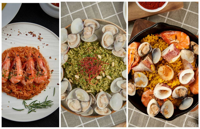 (左)炙燒鮮蝦辣味燉飯;(中)青蛤蠣燉飯;(右)西班牙海鮮燉飯162835
