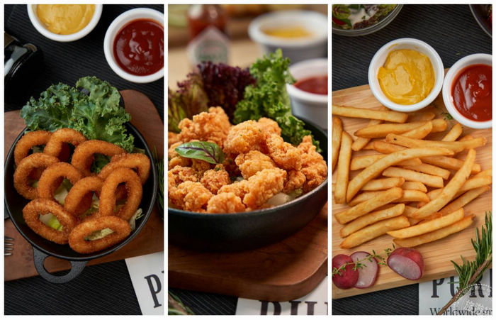(左)洋蔥圈;(中)一口雞米花;(右)美式炸脆薯條