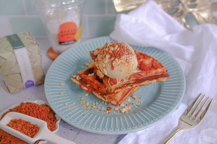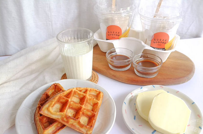 嚴選了日本小麥芯粉與裸麥粉及棕櫚糖獨家調配比例,由於在鬆餅粉內添加了有機棕櫚糖,因此在口感與香氣上更是受有別於一般市售鬆餅,外表微微的酥脆內裏綿密濕潤的口感,只要準備雞蛋和牛奶就能在家簡單自製美味鬆餅,體驗DIY自製甜點的樂趣,還能添加自己喜歡的食材、果醬或新鮮水果,也可以直接淋上SUGARbISTRO精心調制的泰奶醬,最後在頂端放上一球<38%重乳棕櫚糖生淇淋>,一起送入口中感受鬆餅與冰淇淋在嘴裡相溶綿密濕潤的口感,讓人吃進嘴裡,甜在心裡。