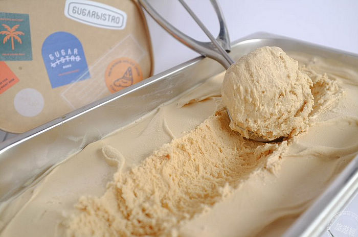SUGARbISTRO「38%重乳棕櫚糖生淇淋」 選用英國原裝進口乳源,乳脂高達38%的動物性鮮奶油與CAMGOLDIA有機棕櫚糖;經慢火熬煮,經過一夜低溫冷藏熟成乳化,成就出入口即化的綿密口感;十足濃醇奶香及獨特的棕櫚糖花蜜香氣融合成獨一無二的絕佳香氣與濃濃奶香,除了單吃冰淇淋外,也可用來搭配任何飲品及甜點,如大眾最愛的鬆餅一起食用!
