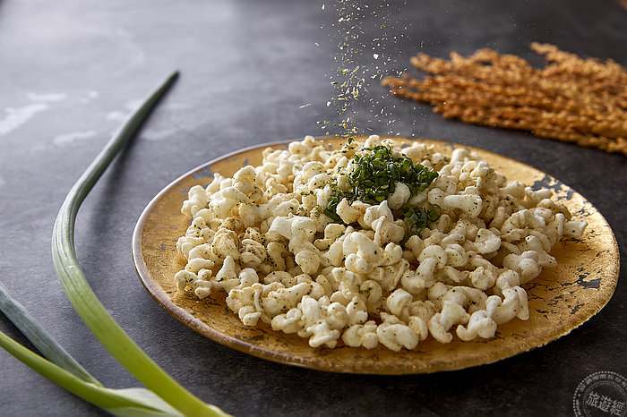 米米花表面覆上海苔,濃濃海苔香搭配淡淡鹽味,再加上外層酥脆,深入咀嚼後咬感十足,調味恰如其分。