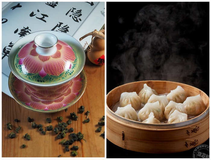 重現茶樓風情(左)飲茶示意圖(攝影:洪書瑱);(左)潮州蒸粉粿(圖:台北美福提供)