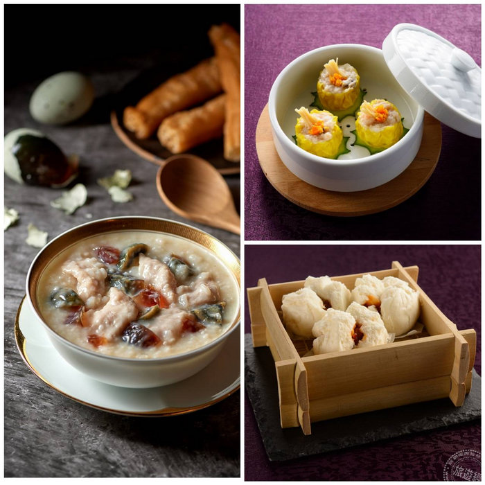 (左)松阪肉片皮蛋粥;(右上)瑤柱蟹黃燒賣;(右下)蠔皇叉燒包(圖:台北美福提供)