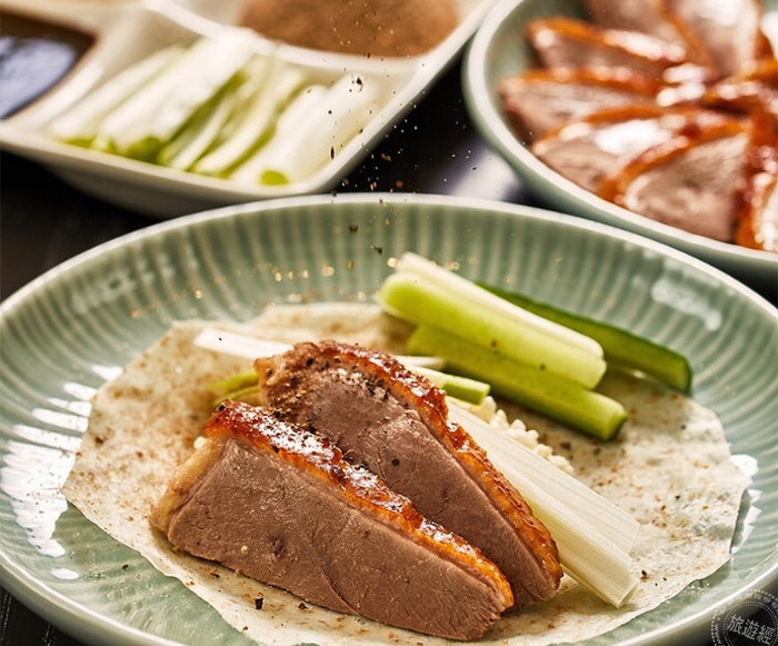 除此之外,主廚還研發9種配料,衍生出81種吃法。保留傳統甜麵醬、蔥段及小黃瓜外,創意的配料此次也一同加入9宮格的中,從甜菜根、蘋果絲到解膩的紅梅醬,甚至是配菜的柚香蘿蔔、自製百香果皆在此次配料中,可隨個人喜好口味隨意搭配品嚐。原價4380元+10%,僅要再多加300元,即可享用到第三吃的料理。