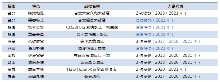 綜觀名單,三家旅宿為近期開幕、首次入榜的新興人氣旅宿,包括:「煙波花蓮太魯閣」、「COZZI Blu 和逸飯店.桃園館」與「名人堂花園大飯店」。此外,具有多年歷史的星級旅宿「台北福華」亦首次入榜。其餘得獎的人氣早餐,更有歷年常勝軍,包括三次獲得此殊榮「雲品溫泉酒店日月潭」、「台南晶英酒店」與「華泰瑞苑」與以及二度蟬聯的「H2O Hotel 水京棧」。而「台北大倉久和大飯店」與第三次獲獎的宜蘭「礁溪老爺」,則是藉其精緻餐點強勢回歸。