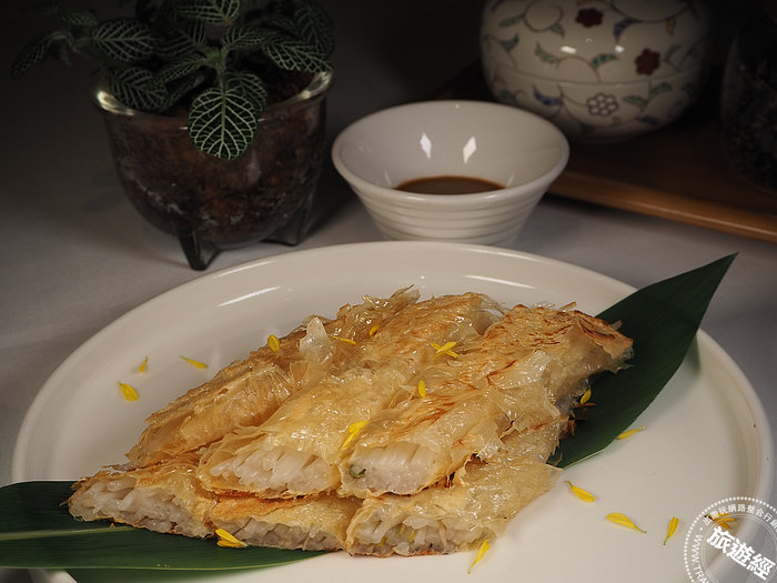 走入民間菜式,「豆衣魚」以豆皮包覆汆燙後的豆芽入鍋乾煎,直至色轉金黃、鍋氣飄香,置於盤中時塑型為魚躍水起之貌,以此為名,搭配色濃味鮮鎮江醋、甘美醬油、胡麻醬汁,口感酥香脆口,醬油與醋的發酵香氣相互平衡,烘托豆皮與豆芽的清甜、胡麻解膩增味。
