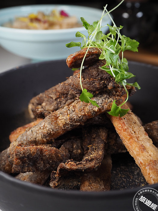 承接海味豐鮮,脆口甘香的「東坡脯」,片取鱸魚魚皮與表層魚肉切條狀,滾過香料花椒、胡椒等香料提香,沾裹淀粉後抹上鹽份,採「油封」概念以麻油薄透輕揩,以烈日曝曬除去水氣保留海鮮豐美與麻油香氣,上桌前入油鍋大火半煎半炸,鮮香脆口、冷熱皆宜,是道宴請友人的小品。