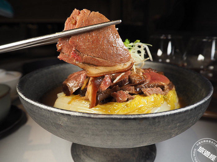 而羊肉在飲食記載中扮演著富華榮美的角色,歷史上宋仁宗「思食燒羊」的記載、蘇軾傳世的文章中對羊脊骨滋味念念不忘,選用嵌著均勻油花的帶皮羊腿肉,切片後,以碎蔥、薑、酒、鹽去腥提味,透過浸泡手法軟化肉質,帶出口感軟糯的「盞蒸羊」,藉由陳皮的去油解燥,並以「盞」為概念的容器盛裝,復刻宋人宴飲饗宴。