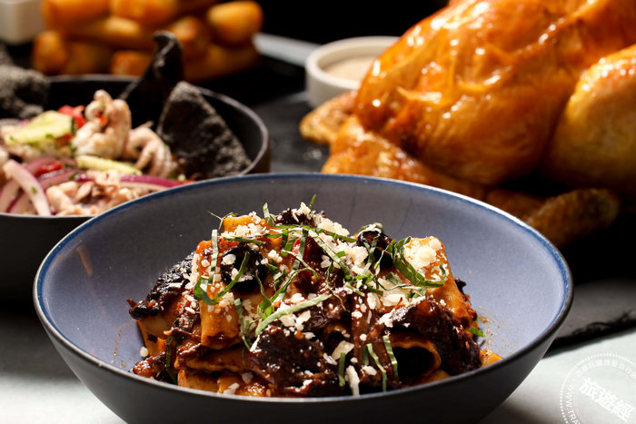 主菜之一「義式紅酒番茄牛尾麵」,是將果肉札實多汁的番茄與紅酒燉煮多時的牛尾肉拌炒義大利寬扁麵而成,成品肉香四溢、麵條麥香十足、吸滿醬汁後軟硬適口,令人回味。套餐中的吸睛重點則是烤得皮酥肉嫩、雞汁飽滿的「香烤手扒玉米雞」,主廚選用肉質細緻的臺產玉米雞,填入混和香料的麵包丁與清甜的根莖蔬菜後進爐火烤,期間需反覆淋上雞油讓表皮色澤均勻且豐美飽滿,整份套餐佳節儀式感十足,適合闔家分享。