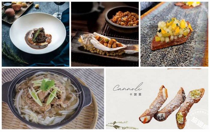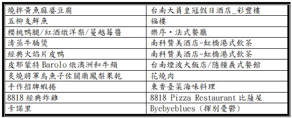 台南煙波大飯店隱糧義式餐館皮耶蒙特Barolo燉澳洲和牛頰;台南大員皇冠假日酒店_彩豐樓 燒拌黃魚麻婆豆腐;花燒肉炙燒將軍烏魚子佐關廟鳳梨果乾;南科贊美酒店-虹橋港式飲茶清蒸牛腩煲;Byebyeblues (揮別憂鬱)卡諾里