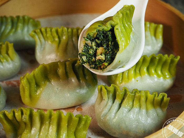 「薺菜素餃」使用薺菜,搭配冬菇、豆干、鮮筍等,吃得到滿滿薺菜特有香氣,喜歡吃薺菜的人不能錯過,外皮的綠色,則是取自天然菠菜汁的顏色,白綠漸層猶如翠玉白菜,單看外觀而言,即是讓人垂愛的菜品。