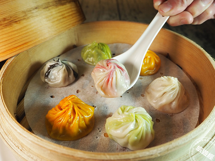 點水樓光是菜單就有200多道菜色,但最引人「津津樂道」就是「七彩小籠包」,外皮是由天然蔬果原汁而來的顏色,黃色來自南瓜及薑黃、紅色來自甜菜根、綠色來自菠菜汁、橘色來自胡蘿蔔汁、黑色來自墨魚汁。七種口味,分別是「黑毛豬肉+老母雞高湯」原味小籠包、翡翠(絲瓜蝦仁)、蟹皇(師傅新鮮手拆螃蟹)、松露、XO、麻辣,與最具代表的臺灣味的九層塔,現在又多了二種口味「櫻花蝦」與「黑蒜」口味,共九種口味。