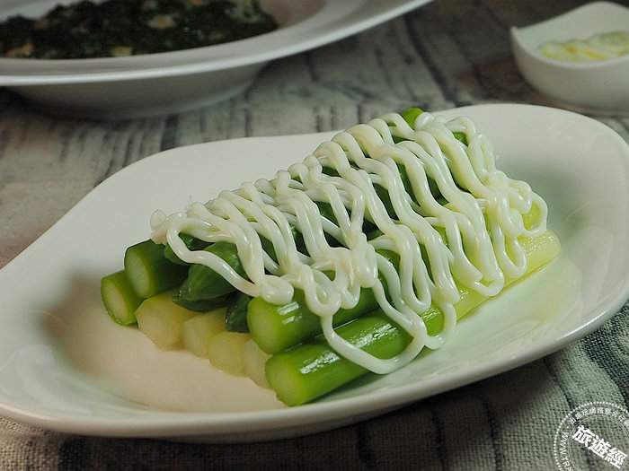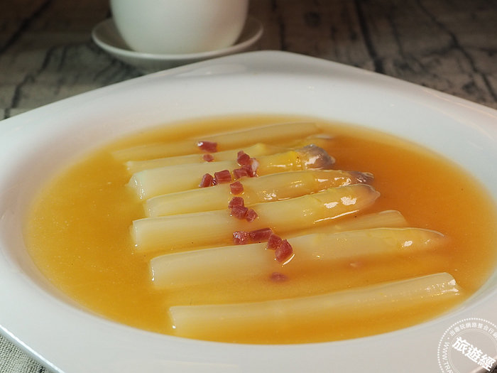 除了薺菜,還有白與綠蘆筍料理,點水樓特別推出在中餐廳難得一見的白蘆筍料理,特選台灣雲林土庫溫室無農藥栽培、產地契作直送鮮嫩白蘆筍,纖維細嫩、風味甘甜富層次,用在地最新鮮的食材來創作獨一無二的白蘆筍料理。代表菜色為「雞汁白蘆筍」用老母雞高湯慢火細煨,將高湯的鮮味煨入白蘆筍中,白蘆筍的鮮甜全被高湯誘出,金黃誘人的高湯中環抱著白蘆筍,香味撲鼻。