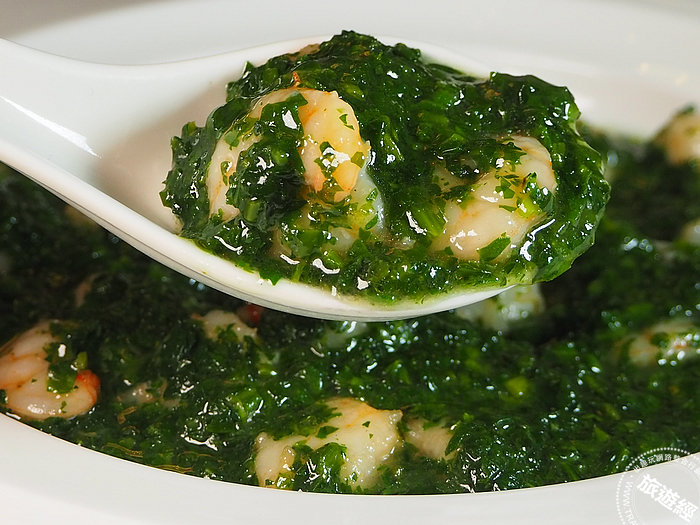 「薺菜蝦仁」春天盛產薺菜特別適合與各類海鮮搭配,翠綠淡雅薺菜搭配宜蘭外海現流劍蝦仁一起拌炒,蝦肉Q彈、蝦味濃,一入口,蝦仁的鮮味讓薺菜特有的清香更加鮮明而迷人。