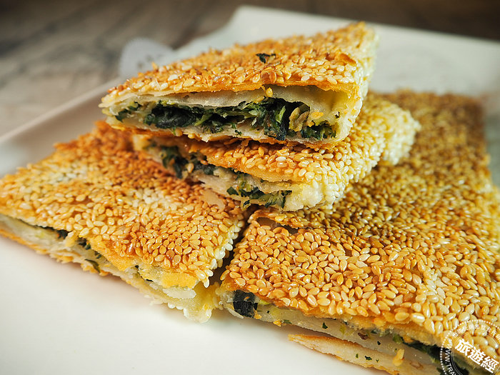「薺菜鍋餅」,使用薺菜,搭配蝦仁、青江菜、香菇、杏鮑菇、豆干、鮮筍等,口感酥脆層次分明,將餅皮附的食材包裹其中,皮外在鋪上一層白芝麻,咬下去就是一口酥、脆、香。