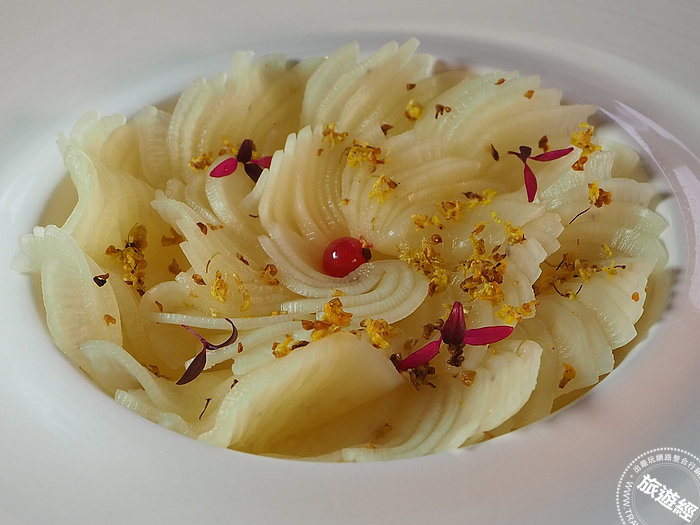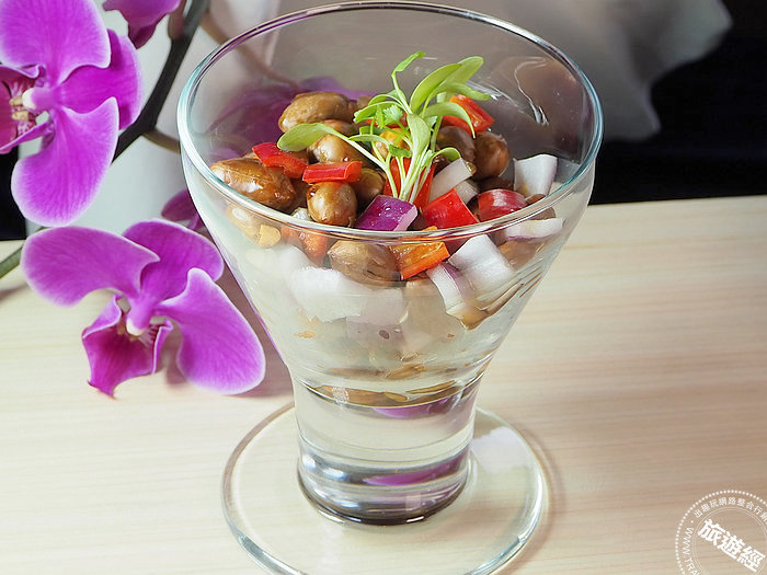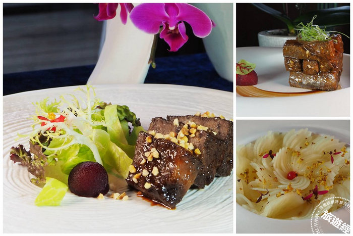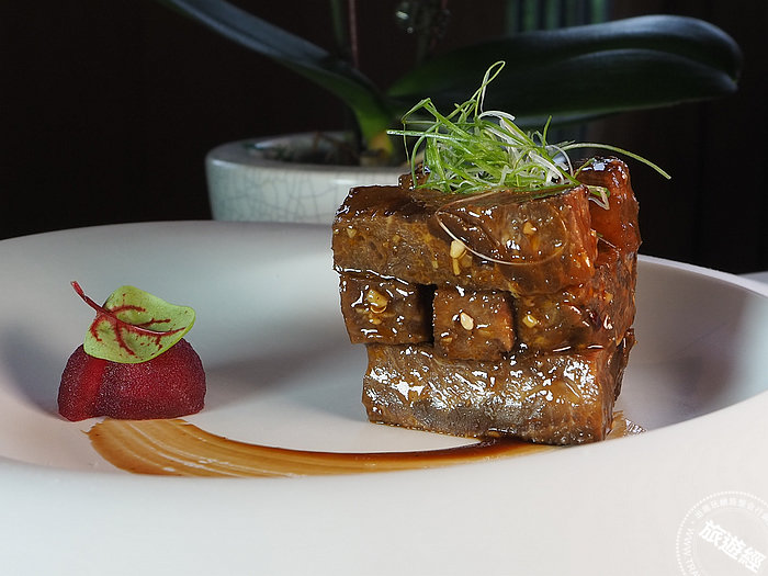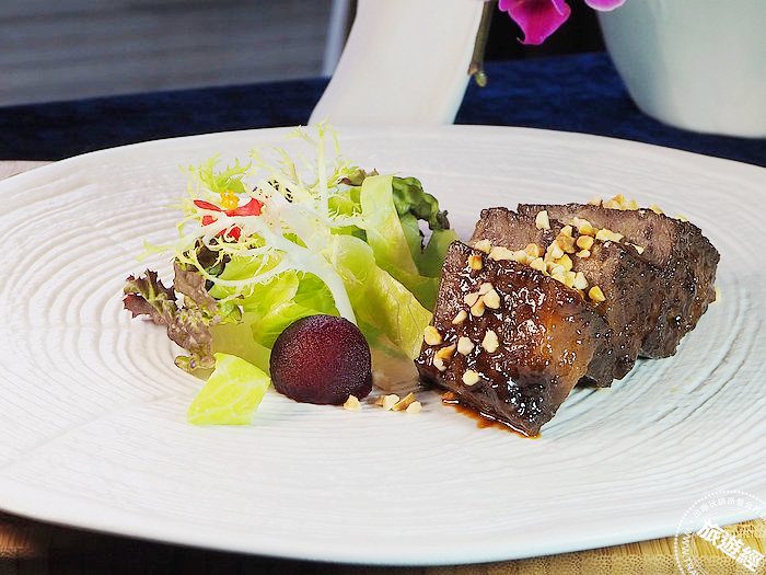另一道套餐主菜「櫻桃木燻澳洲和牛頰」,以燜、烤、燻三重手法製成,澳洲和牛低溫燜滷4小時,保留軟嫩質地,進烤箱前刷上特製台式沙茶醬添味,再用西式手法,以櫻桃木屑煙燻增添木質香氣,最後佐以清脆生菜精緻乘盤,入口即感受到細火慢燉的絕妙滋味。而且主廚還特以冬瓜經過3+4天二次醃漬成洛神冬瓜球,除了為擺盤增色,也在品嚐中多一些食趣及品嚐的層次滋味!