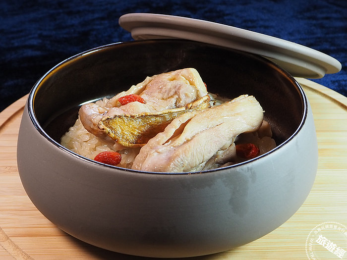 「花膠白蘆筍燉雞盅」:相當適合春夏季節享用,有別於傳統濃底燉湯,特別選用甜度達8度的紫玉白蘆筍,將筍皮熬煮成湯汁替代白水,加入仿雞腿、白蘆筍段與泡發後的花膠製成中式澄清雞湯,湯清見底且清爽不膩口,吃得到花膠滑嫩膠質與白蘆筍的細緻清甜滋味。