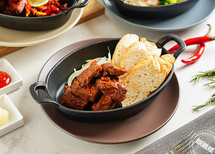 源自法國勃根地經典料理,將油花均勻口感軟嫩的美國特選原塊牛肋油煎上色鎖住肉汁盛起靜置切成適口大小,另將洋蔥、紅蘿蔔、西芹等炒香後加入蕃茄糊、紅酒與牛肉高湯,大火煮開後連同牛肋塊以小火悶煮約60分鐘,入口似化的肉質豐美多汁並有淡雅酒香,濃郁醬汁搭配佐餐法國麵包,叫人欲罷不能。