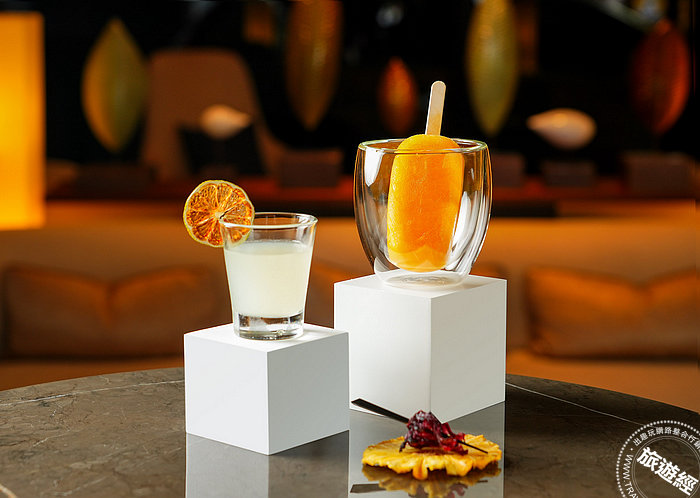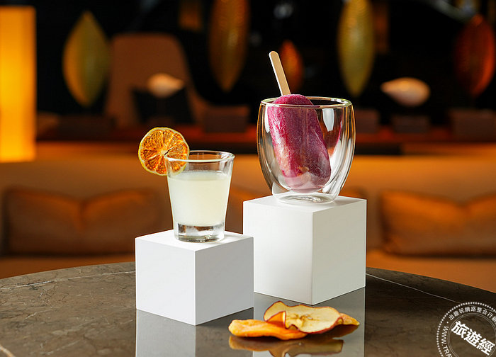 加入自製檸檬香甜酒的愛玉凍,尾韻些微的苦味在口中滑過,泛起一絲夏日漣漪;此時建議搭配以梅酒、黑醋栗伏特加和百香果為原料的特調一起品嚐,讓不同果香在口中盪漾出微醺的夏日風情。