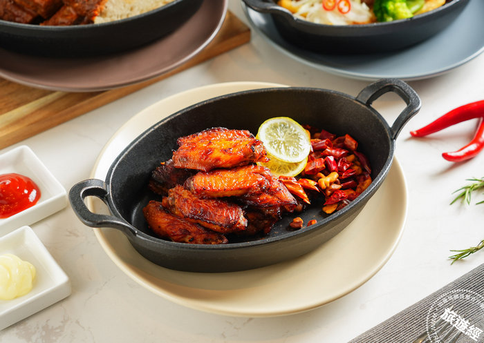 雞翅洗淨去翅尖瀝乾後以番茄醬、洋蔥、蒜頭、煙燻汁與黑糖調和的BBQ醬料醃製,俟香料入味後以旋風烤箱180度烤10分鐘,出餐前拌上以由獨家墨西哥塔可醬、塔巴斯科辣椒醬與檸檬汁調配而成的辣味香料醬,狂放辛香滋味讓人淋漓暢快欲罷不能!亦可搭配麻辣堅果一同享用,增添口感層次,強力推薦給無辣不歡的朋友。