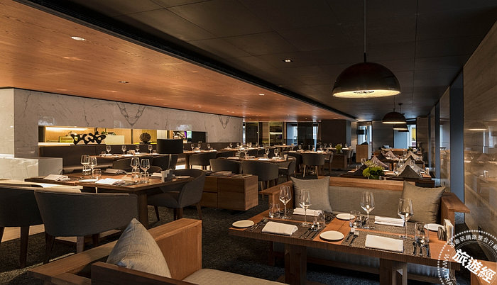 【慕軒飯店】GUSTOSO採用低調沉穩的色調搭配高質感原木色傢俱,窗外緊鄰敦南綠蔭景色,營造舒適的用餐空間