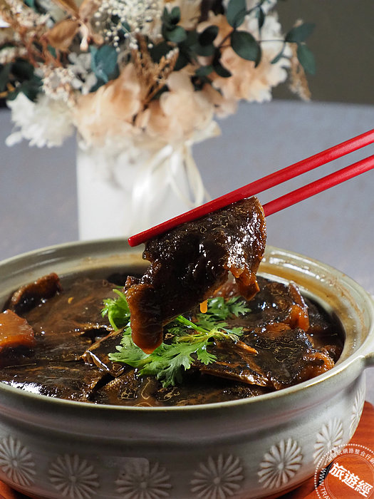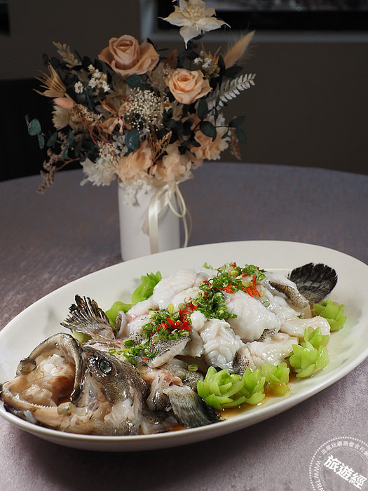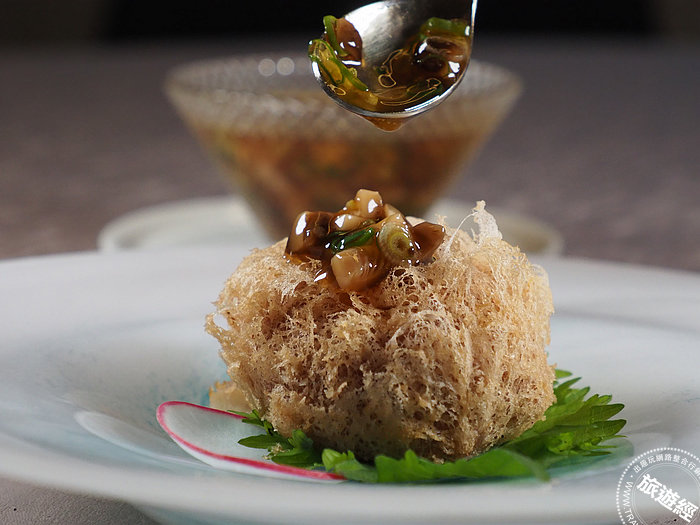 荔蓉釀帶子:是一道廣東傳統的喜宴菜,帶有早生貴子的吉祥寓意。作法是將帶子汆燙至半熟,再用蒸熟並以鹽糖調味的芋泥包覆成球狀,接著入鍋油炸,起鍋後再搭配主廚自製的蒜蓉醬一同品嘗,口中盡是鹹、甜、鮮。