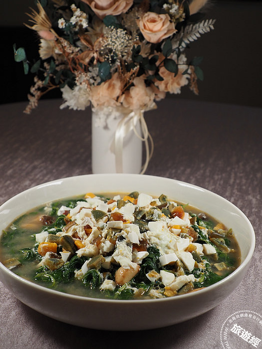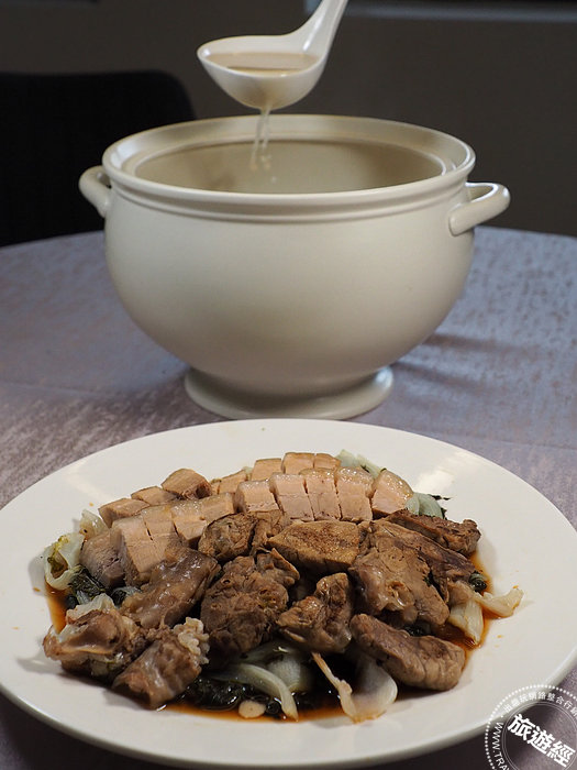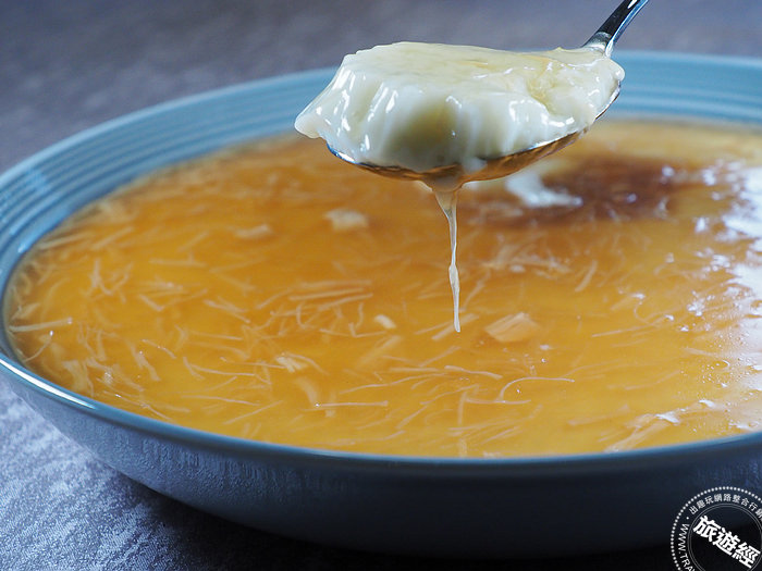 花雕蒸蛋白:是一道非常簡單卻又美味的家常菜。首先將蛋白與水以一定的比例調配成蛋液,再入蒸籠蒸製。簡師傅特別說蒸蛋前記得要以保鮮膜封口,才能蒸出滑嫩沒有氣孔的完美蒸蛋,最後再淋上以花雕酒、醬油和瑤柱製成的鮮美芡汁,鹹鮮滑口。